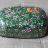 A hand-painted Kashmiri papier-mâché curved box measuring 7×4 inches, featuring vivid floral art and charming hoopoe and sparrow motifs. Finished in a golden-green base with purple blossoms, this collectible piece blends Mughal elegance with traditional craftsmanship — perfect for home décor or gifting